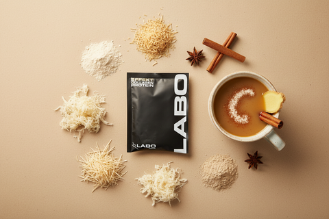 Die Rezeptur kombiniert hydrolysiertes Rinderprotein aus Weidehaltung mit Zimt, Ingwer, Kurkuma, Fructooligosacchariden aus Chicorée, Akazien- und Bambusfaser sowie Steinsalz. Das Ergebnis ist ein vollmundiges Pulver mit würzig-aromatischer Note, das zusätzlich 6 g Ballaststoffe pro Portion liefert und die Verdauungsfreundlichkeit unterstützt.